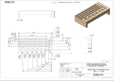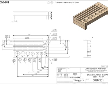 We manufactured a tray to hold a very precise Broaching set for WDS in Leeds, it first starts off with a Cad drawing wich we draw up and run through or Cnc simulator to produce an accurate 3D view of the part as well as an actual hard copy for customer approval